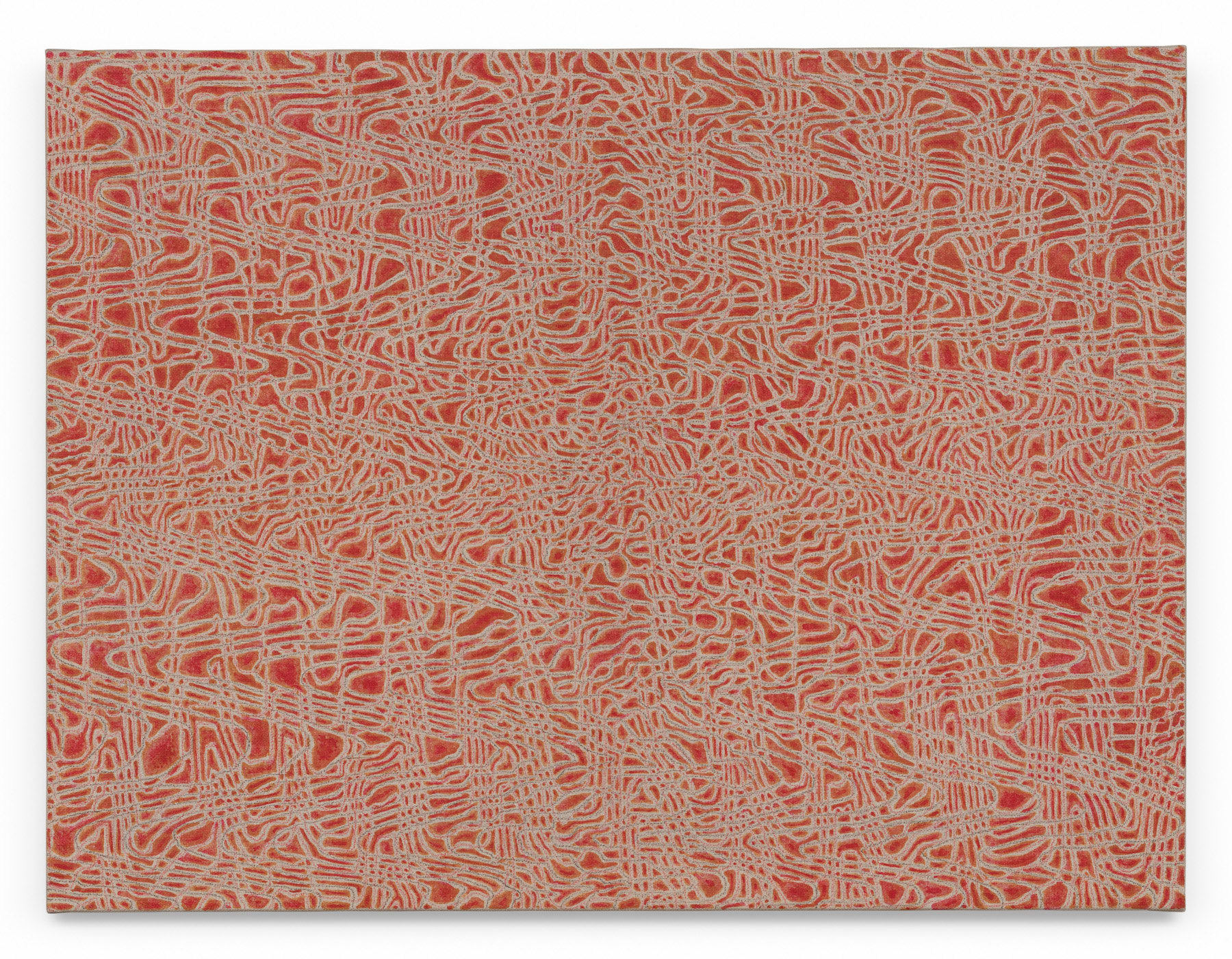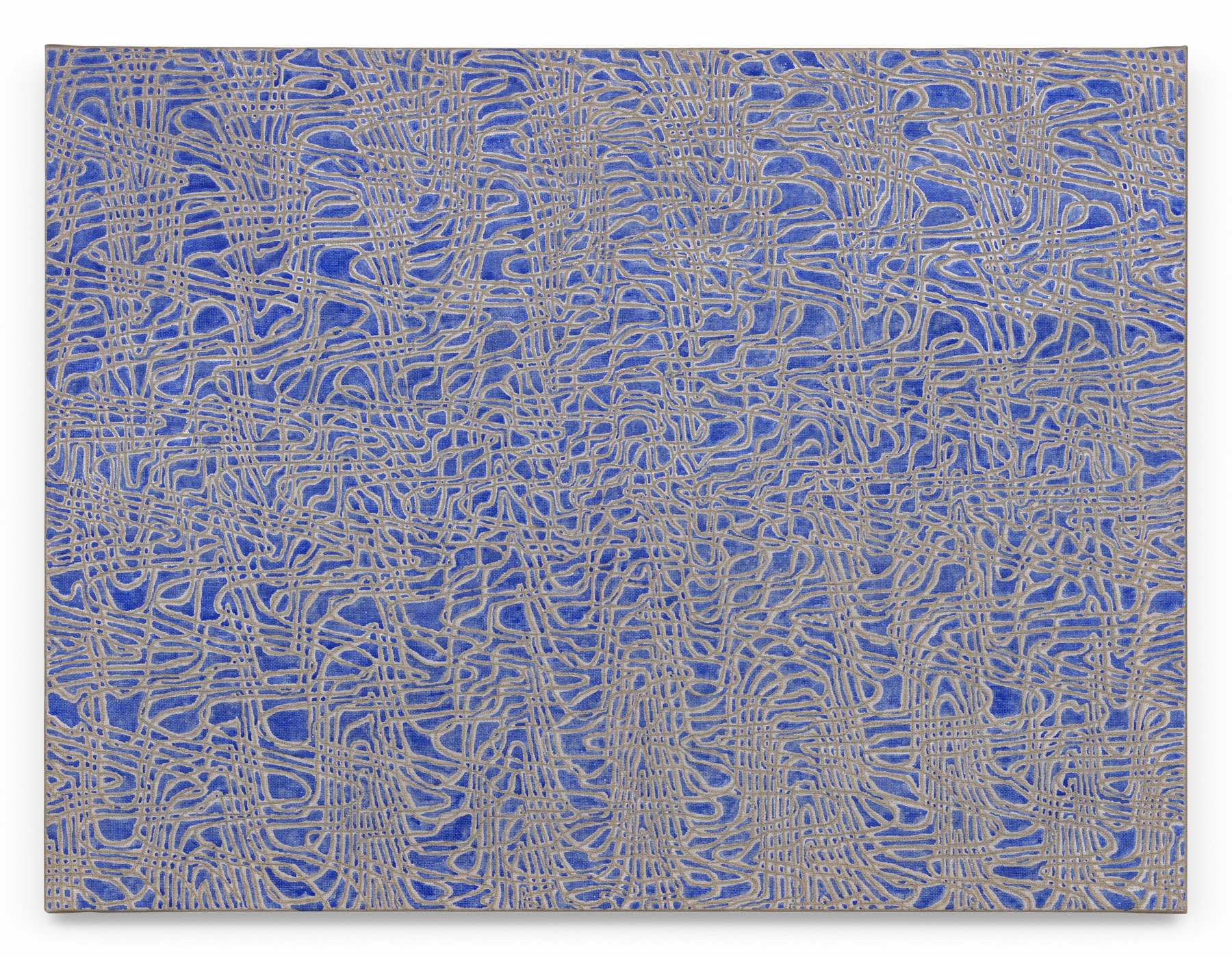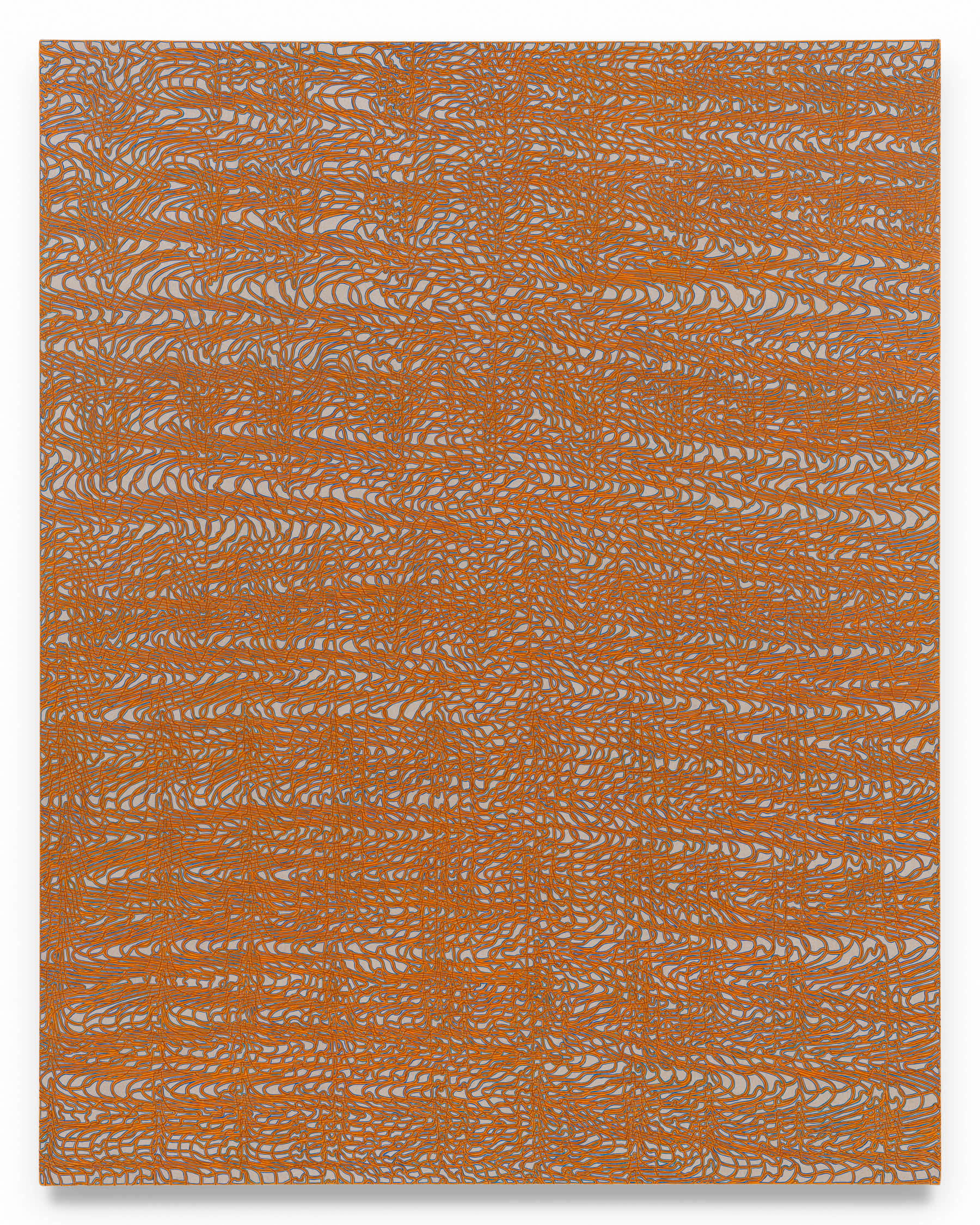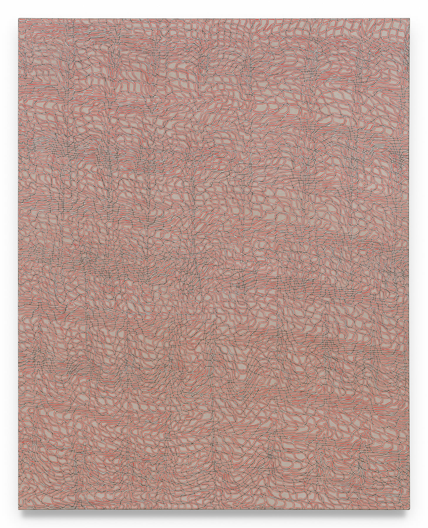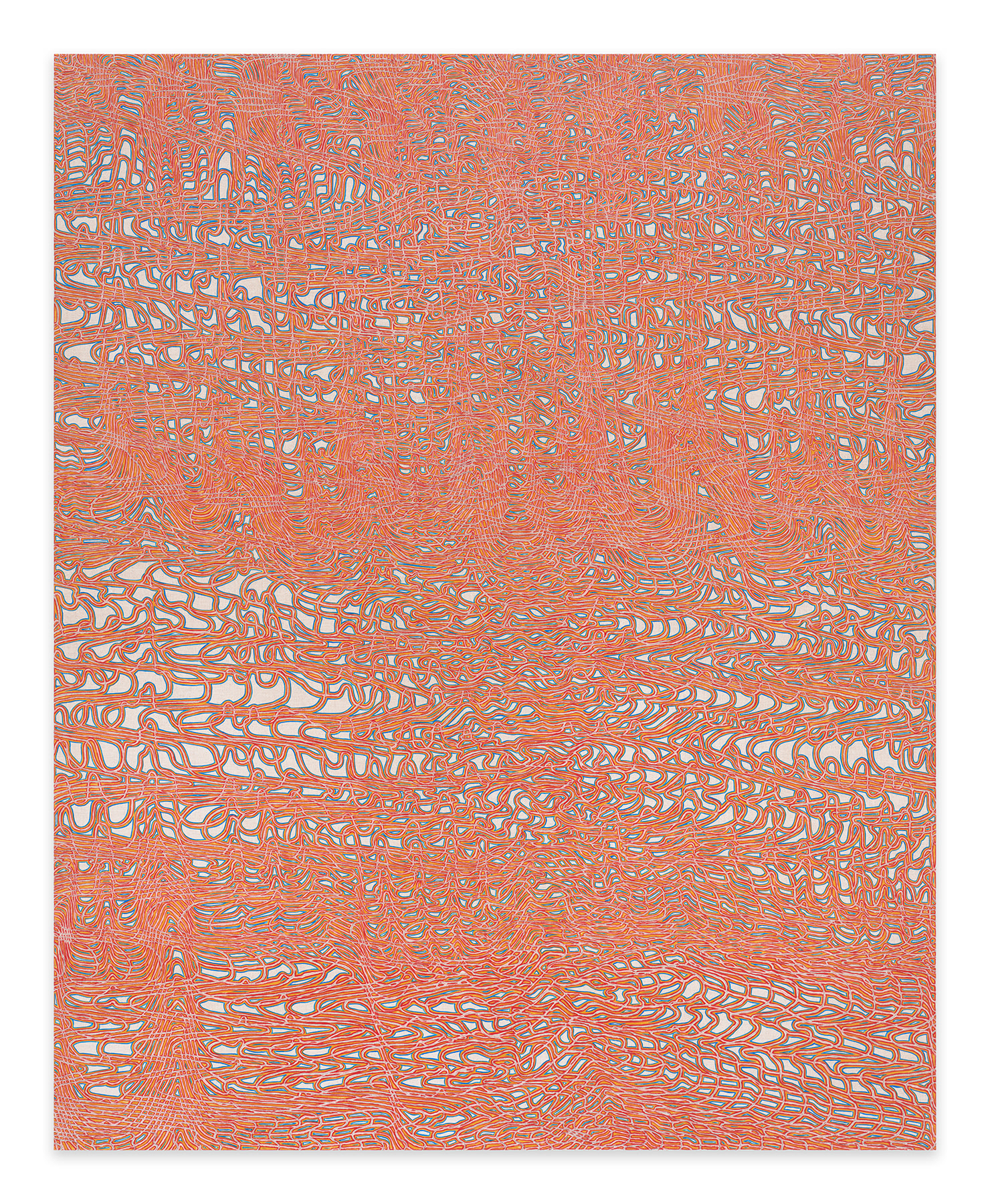 "In Elutea (2024), a wide-bodied, one-color work, the artist’s tightly fitted pirouettes and turns are nearly unfathomable. It is almost as if we’re engaged with sound waves, or the wiggle of desert mirages. Though it is as systematically careful as it is sprawling, Elutea remains a generative engine of novel textures. Obsession accounts for one attribute of these luxurious accumulations. And persistence seconds the motion. Though extremely fine lines saturate Elutea, they never stop short or fail to advance the picture. From another point of view, their fineness might seem vulnerable, as if some nut with scissors could clip and shred them in a trice. Yet nothing unravels in this painting or undermines the muscular achievement of its presence."
